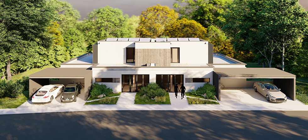 Dieses gespiegelte Doppelhaus bietet hinter der modernen Frontansicht ungeahnte Raumnutzung. Der hintere Bereich der Doppelhäuser ist in Hanglage gelegen, wodurch die Größe und Komplexität dieses Bauwerks erst beim Betrachten der Rückseite zur Geltung kommt, während die Frontansicht modernen Minimalismus suggeriert.