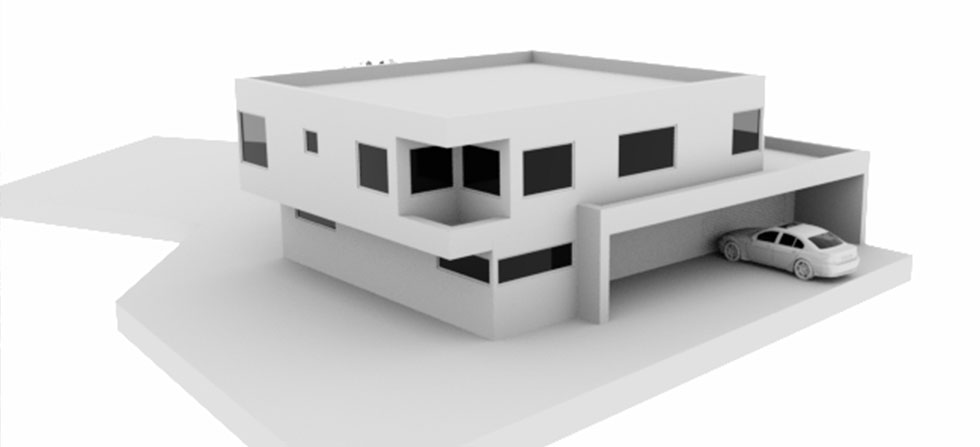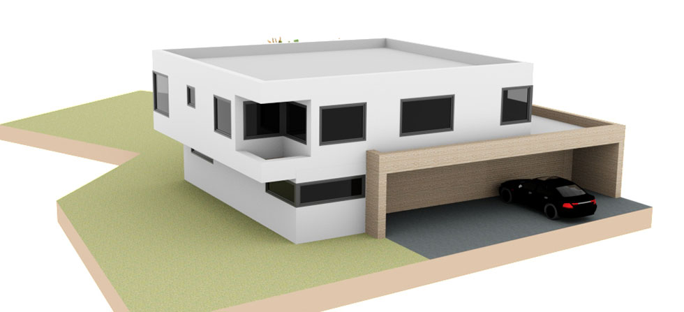 Entwurfsgrafiken eines modernen Flachdachbaus.